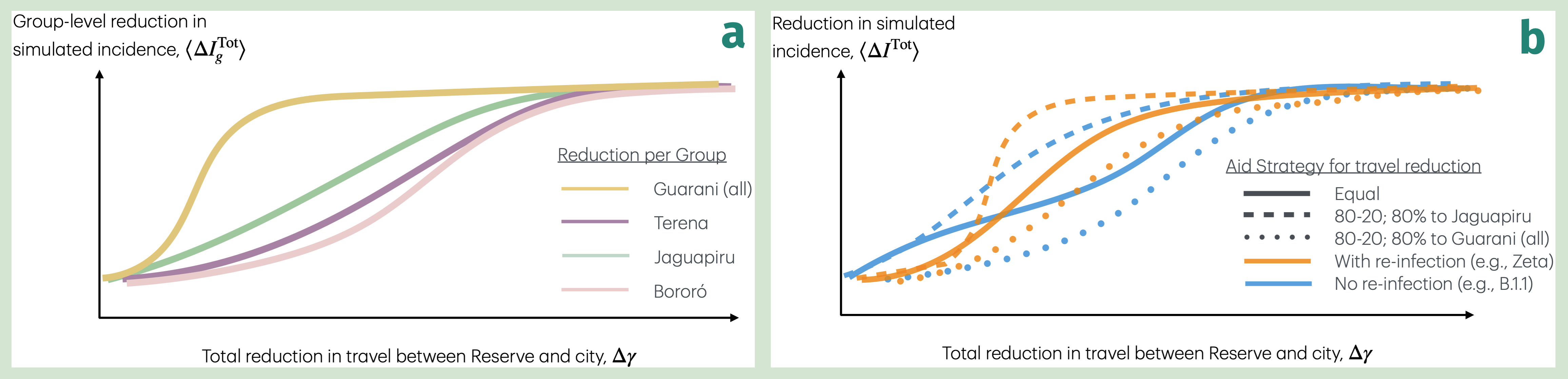 The model represents disease transmission through travel between the Reserve and the city of Dourados, followed by local spread shaped by interpersonal contact networks. A schematic overview of this structure is shown in Figure 4, where mobility and contact behaviors for different social groups are represented symbolically.